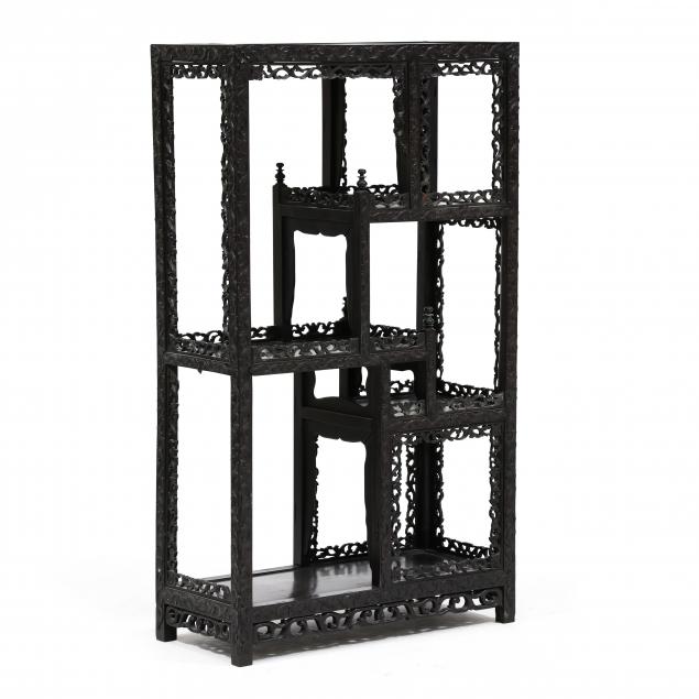 Circa 1900, asymmetrical shelves with flowing vine relief carved edges and pierced fretwork.
