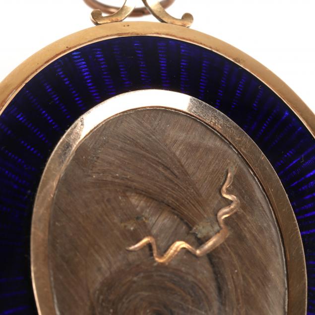 Circa 1800, watercolor on ivory, unsigned, the lady attired in white dress with conforming headscarf, against a cloud filled sky background, presented in a fine gilt locket case, the verso aperture retaining plaited hairwork and lock within a gilt bezel and radial blue enameled foiled glass surround.