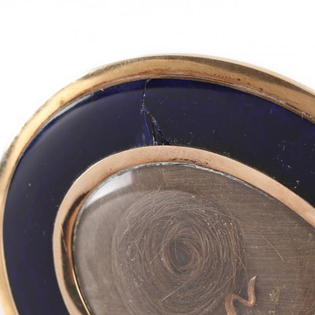 Miniature with two tight hairline to far right perimeter, some light rubbing to upper hair and scarf; not examined out of the case; blue glass with chip and associated hairline.