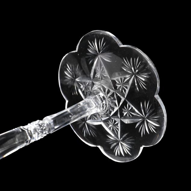 France, late 20th century special order, tapered cup with star, button and leaf motif, faceted stem with central diamond pattern band, scalloped foot with underside cut star motifs, signed.