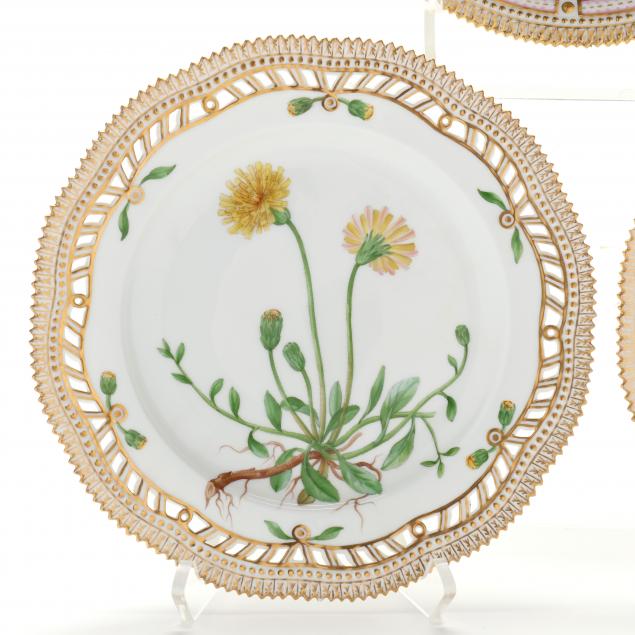 Made in Denmark, hand-painted with floral motifs and gilt rim, including a pair of luncheon plates with openwork rim, late 20th century date marks, pattern 3554, floral motifs include Carduus acanthoids and Hieracium Pilosetta (9 1/4 in. diameter); together with a dinner plate, 1946 date mark, pattern 3549, Nigritella angustifolia Rich. The undersides marked and numbered with company backstamps and floral names.