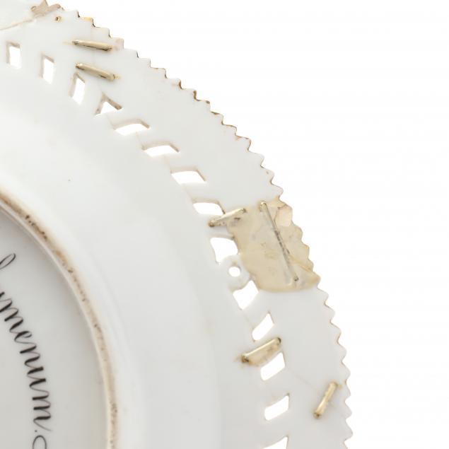 Made in Denmark, hand-painted with floral motif within pierced gilt rims, the first a dinner plate, pattern number 3553, 1964 date mark, with Viola stagnina Kit. floral motif (10 in.) (small area of restoration to rim edge); the second an antique plate with late 19th century date mark, featuring Lonicera periclymenum floral motif (9 5/8 in.) (scattered breaks and associated repairs to rim, some staining to underside).
