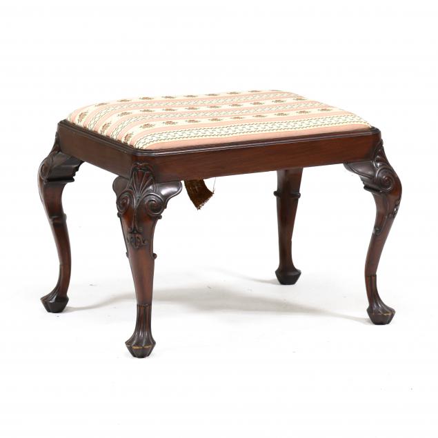 Early 20th century, upholstered slip seat, molded seat rails, foliate and scroll carved knees on stylized trifid foot with raised pad.