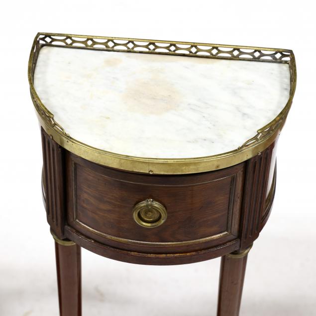 Late 19th century, mahogany, oak secondary, wall-mount form, D-end form with conforming marble top and pierced brass gallery, convex single drawer flanked by fluted stiles, two turned tapered legs with lower conforming shelf, brass cap feet.