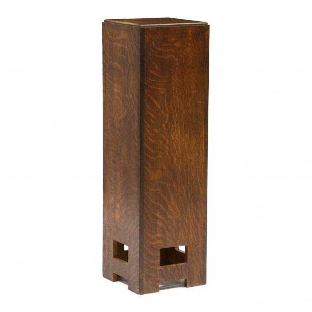 Circa 1910, unmarked, square tall form with raised panel, each lower side with rectangular pierced cut-out above an arched foot, straight feet from the solid.