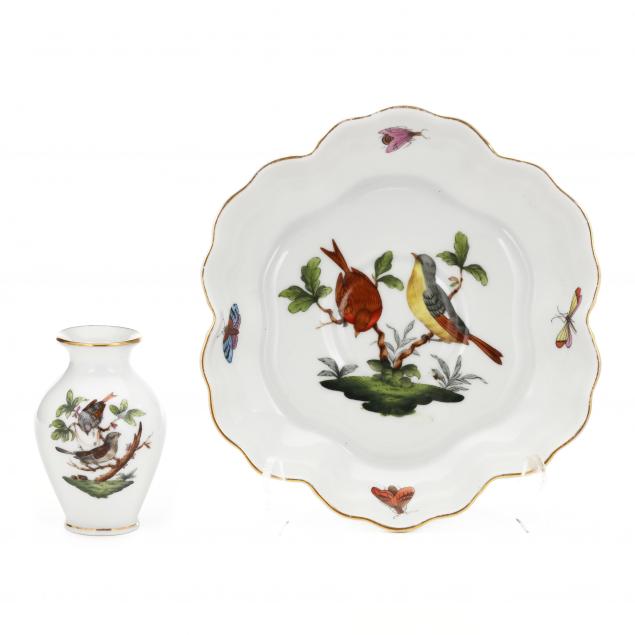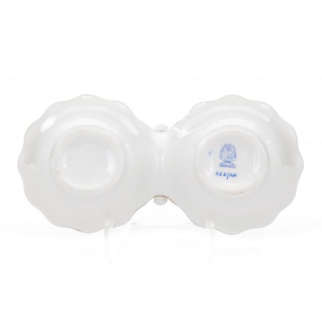 Six pieces to include: a salt and pepper dish with handle (2 x 6 x 2 3/4 in.), a lidded egg box (3 x 5 x 3 1/8 in.); a baby shoe ornament (2 x 4 x 2 in.); a jam or jelly jar with attached underplate and spoon (5 x 5 x 5 in.); a melon bowl (5 5/8 in. dia.); and a miniature bud vase (2 3/4 in.), all marked.