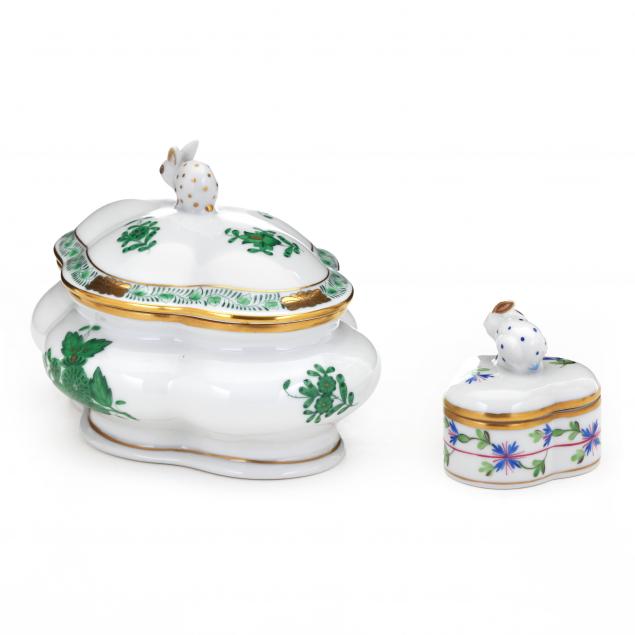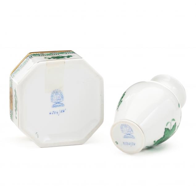 Green Chinese Bouquet pattern a miniature bud vase (2 3/4 in.); an octagonal box with cat lid, pattern number 6074; and a candy box with rabbit lid, pattern number 6055 (4 x 5 1/2 x 4 1/2 in.); in the