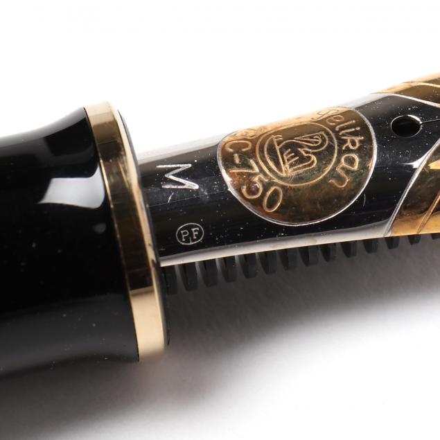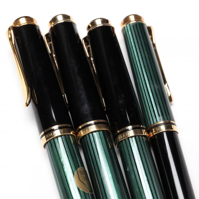 Each with a green striated and black lacquer exterior with gold-tone mounts; includes an M 600 Fountain Pen; (2) R 600 rollerball pens; and one K 600 ballpoint pen; all with original presentation cases, most retaining pamphlets, the lot also includes a boxed set of 338F rollerball replacement cartridges.