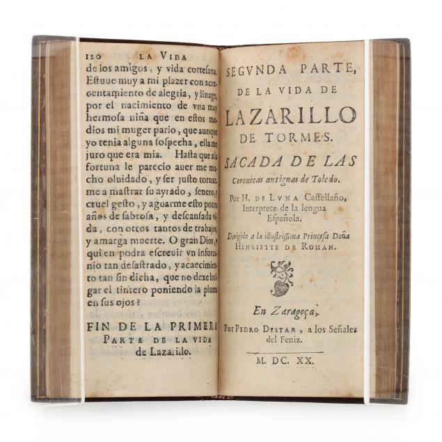 VIDA DE LAZARILLO DE TORMES. CORREGIDA, Y EMENDADA. Zaragoza: Por Pedro Destar, a los señales del Feniz, 1520 (i.e. 1620). La Primera Parte bound together in one volume with [Juan de Luna]. SEGUNDA PARTE, DE LA VIDA DE LAZARILLO DE TORMES, SACADA DE LAS CORONICAS ANTIQUAS DE TOLEDO. Zaragoza (i.e. Paris): Pedro Destar, a los señales del Feniz, 1620. First edition. Gilt-paneled leather, gilt-stamped spine with raised bands, marbled endpapers, all edges gilt. 12mo; a6 A-E12; a6 A-G12; [12], 120pp.; [12], 168pp. Roman type with italic; text in Spanish. With bookplate of Don Ricardo Heredia on front paste-down. USTC 347197.