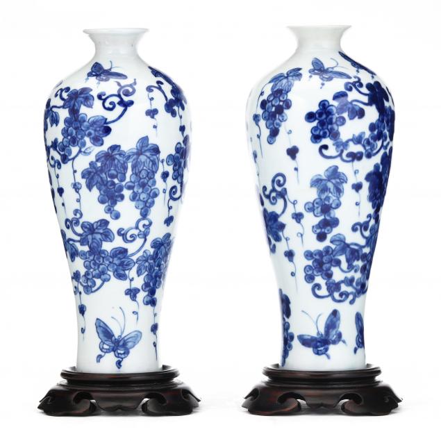 19th century or earlier, elegant porcelain vases hand painted in underglaze blue with grapevines and butterflies, six-character Kangxi mark in underglaze blue to underside of each, come together with carved wooden stands.