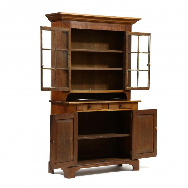 Circa 1840, two part form, poplar secondary, pronounced cove molded cornice, two hinged doors with six window lights each, molded mullions, fixed shelf interior, the base with two flush drawers over two hinged paneled doors, fixed shelf interior, shaped bracket foot base.