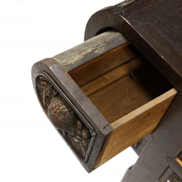 First half 20th century, flush paneled top with rounded ends, four relief carved panel drawers on shaped straight legs with pierced returns.