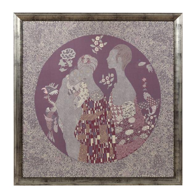 After the original design by Bottega Veneta, circa 1980s, featuring three framed printed scarf panels, the center panel depicting three women in a roundel against a background of floral motifs; flaked by two matching panels of a medieval style woman in a forest, without visible marks or labels.
