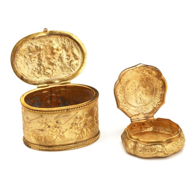 Late 19th-early 20th century, to include two diminutive ormolu boxes, the first in oval form with Bacchanalian relief decoration, underside marked AB within diamond lozenge punch (2 in.), and the second an ormolu pill box, with figural and floral repousse decoration, unmarked (1 in.); the third a cobalt porcelain lidded box with ormolu mounts, marked SEVRES to underside (2 x 4 1/4 in. diameter); the third a Sevres style octagonal box, hand-painted lid with scene of courting couple within gilt decorated borders, gilt crossed arrows marks to underside. (1 x 2 3/4 in.).