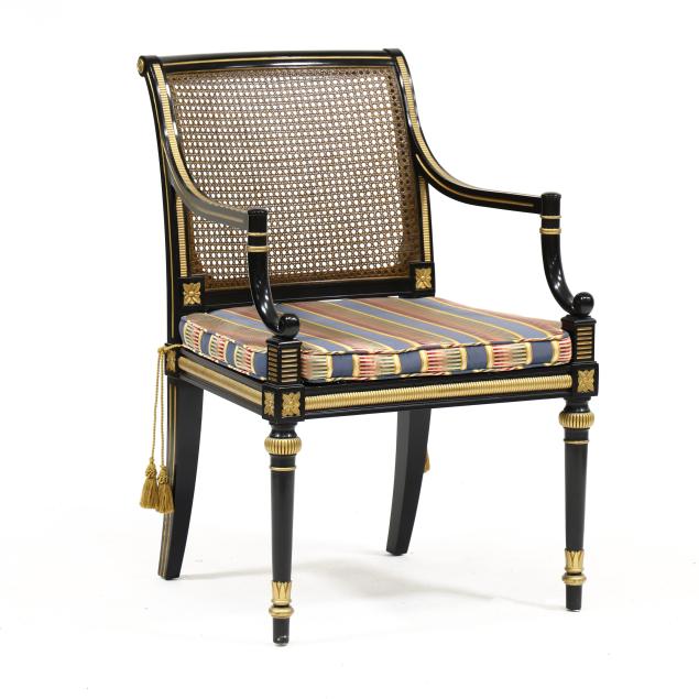 From the Collection of a Southern Gentleman, Atlanta, Georgia Overall good estate condition; some staining to the silk seats; one armchair with black lacquer loss at crest rail; other minor signs of use; caning all appears intact and tight.