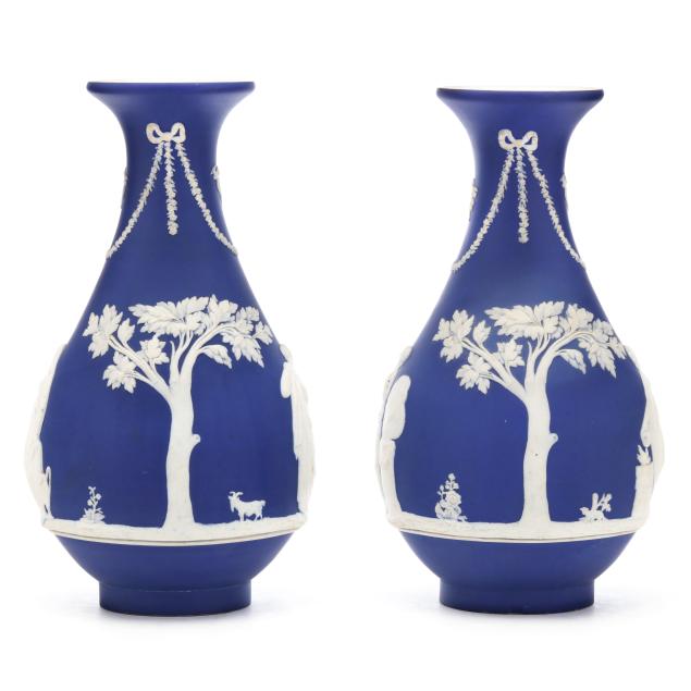 Bottle form bud vases with round foot, each decorated in white cameo Classical style figural decoration, the undersides stamped "64," otherwise unmarked.