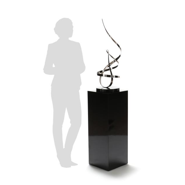 2011, two-part form in stainless steel, signed and dated to lower ribbon, the smaller ribbon swirling within the larger ribbon, mounted upon a black polished hardstone terrace, together with a laminated wood plinth and artist brochure.