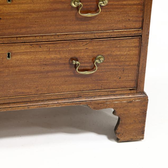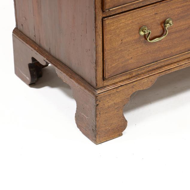 Late 18th century, mahogany veneer, oak and pine secondary, top with banded rear edge, slant lid with lipped edge and loper supports, interior with six small drawers, central prospect door and six pigeonholes, the case with four graduated cock beaded drawers, shaped bracket foot base.