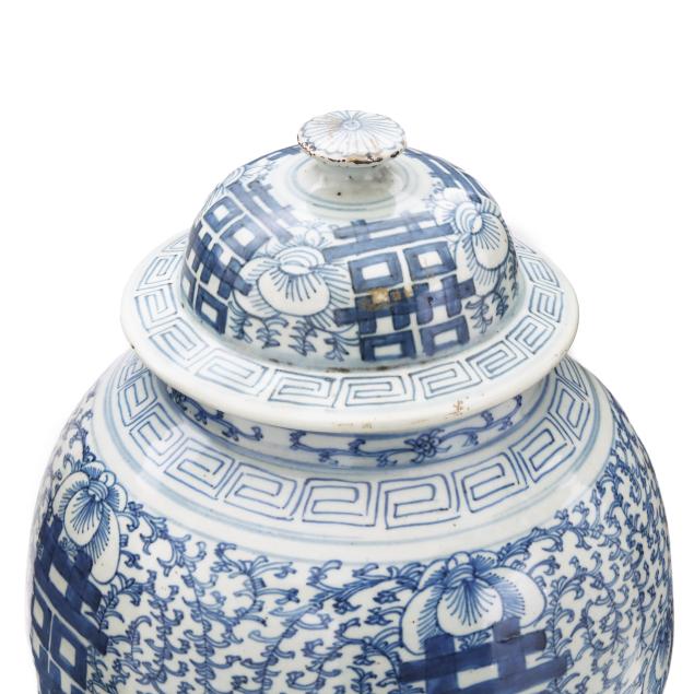 Porcelain hand painted in underglaze blue with peony and scrolling vine decoration on body and cover, four double happiness symbols on the body and on the cover, key motif surrounds the upper body and along the rim of the cover, four character apocryphal mark to underside of each.