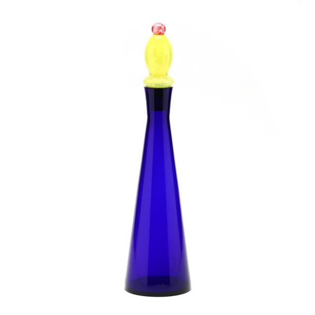 Late 20th century, blown multi color glass including a cobalt decanter with yellow/orange mottled stopper (17 in.); (6) inverted bell form wine glasses (9.75 in.); six wine goblets (9 in.); and (6) cordials (3 in.), with foil labels.