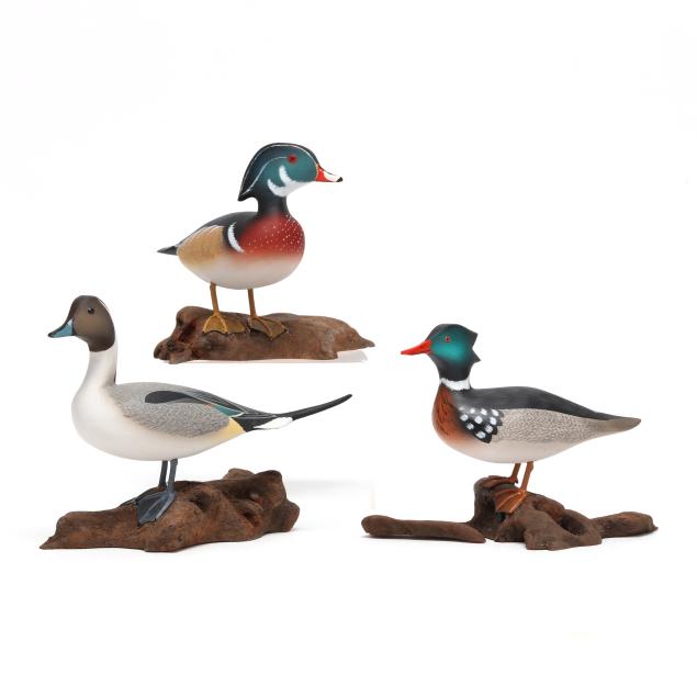 Curtis Waterfield (VA, 1926-2017), Variety of Three Miniature Waterfowl Carvings on Driftwood
