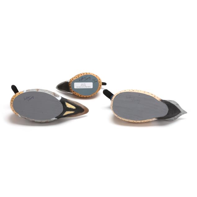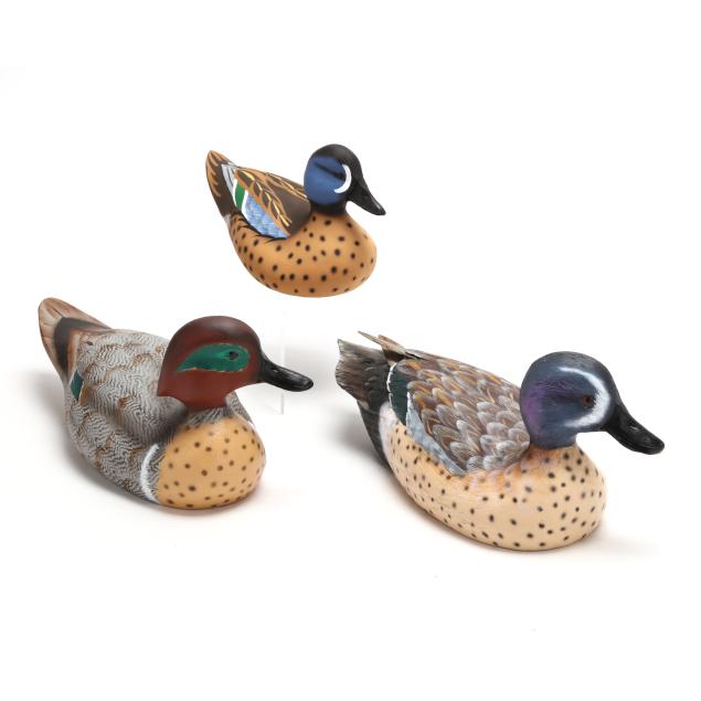 Elkton, Maryland, circa 1990s, carved and painted wood, glass eyes, larger two signed in pen WILLIAM VEASEY, smaller one signed in pen WILLIAM VEASEY / 27/100 with sticker LEGENDARY TEAL COLLECTION / WILLIAM VEASEY / 302-383-6829 / ELKTON, MD.