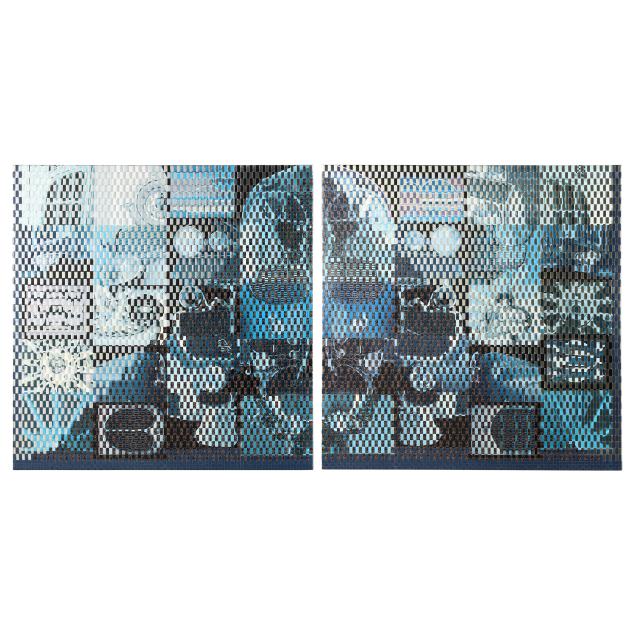Woven fiber mosaic on canvas, a diptych, signed and inscribed to the verso, gallery wrapped canvas.