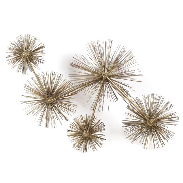 1979, brass rods with five variously sized sea urchins or pompoms, ink marked at far right arm.
