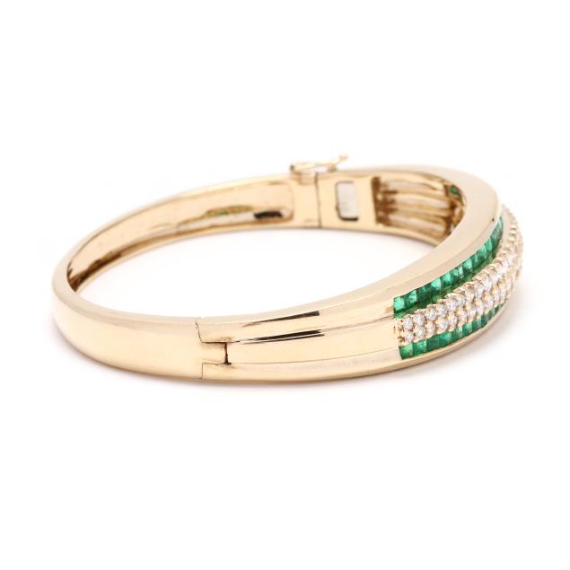 In a tapering hinged bangle design and bead set with two rows of full cut round diamonds weighing approximately 1.70 total carats (G-H color, VS2-SI1 clarity) set between two rows of channel set square cut emeralds weighing approximately 2.90 total carats, completed with an integrated clasp with figure eight safety, stamped 14KT and with maker's mark CEI.