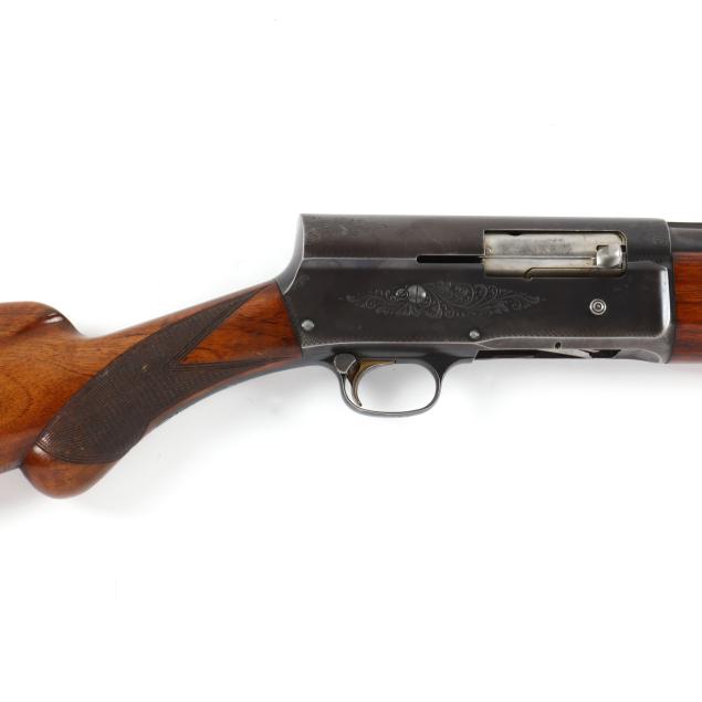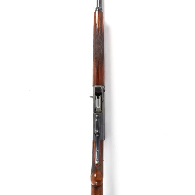 Serial number G91221 on bottom of receiver, 26 in. blued barrel marked BROWNING ARMS COMPANY ST LOUIS MO. / SPECIAL STEEL 12 GAUGE SHELLS 2 3/4" / MADE IN BELGIUM with single front bead sight, Deluxe Poly-Choke, checkered walnut stock and forend with original buttplate marked BROWNING AUTOMATIC.