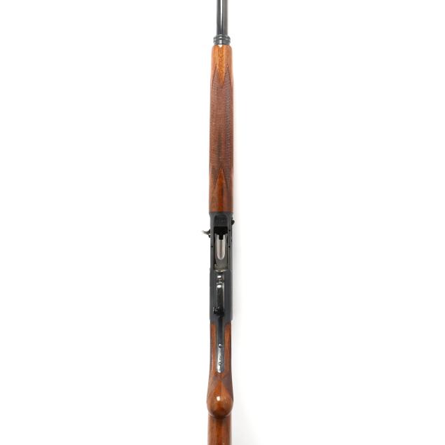 Serial number 5G6346 on bottom of receiver, 27.5 in. blued barrel marked BROWNING ARMS COMPANY ST LOUIS MO. & MONTREAL P.Q. / MADE IN BELGIUM / SPECIAL STEEL 12 GAUGE SHELLS 2 3/4", ventilated rib with single bead sight, barrel choked F, blued receiver marked BROWNING LIGHT TWELVE with additional scroll floral patterns, checkered walnut stock and forend with original buttplate marked BROWNING AUTOMATIC.