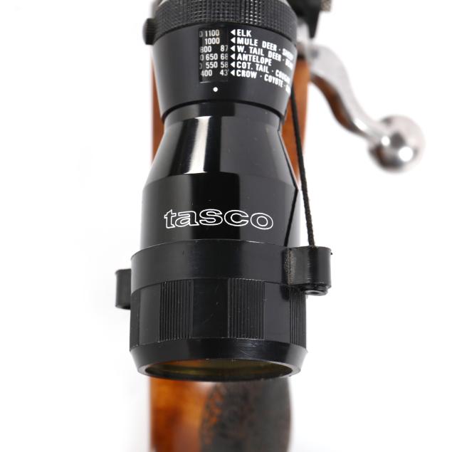 Serial number 4780964 on forward top of receiver, 24 in. blued Shaw made heavy barrel with two machine taps for front sight, TASCO 6-24x40 duplex reticle scope, receiver marked U.S. / SMITH-CORONA / MODEL .30-03, hand stippled stock with high rise comb, beavertail forend, hand-stop groove, adjustable recoil pad.