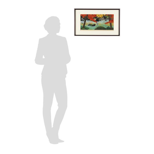 Known for his serene landscape prints of traditional Japanese subjects, Ido found his inspiration in Kyoto and the surrounding countryside. His tranquil images of private gardens, quiet streets, temple gates, and hillside views reflect his interest in nature and the changing seasons. A simplicity of form and a masterful layering of subtle color to achieve a sense of depth and richness distinguish his prints.