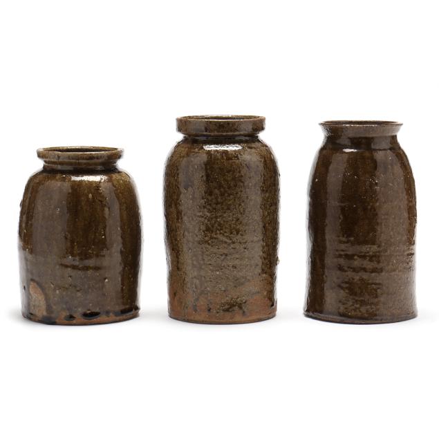 19th century, all with collars and inner ledges, runny alkaline glazes, probably 1/2 gallon size, one is so marked, none are signed.