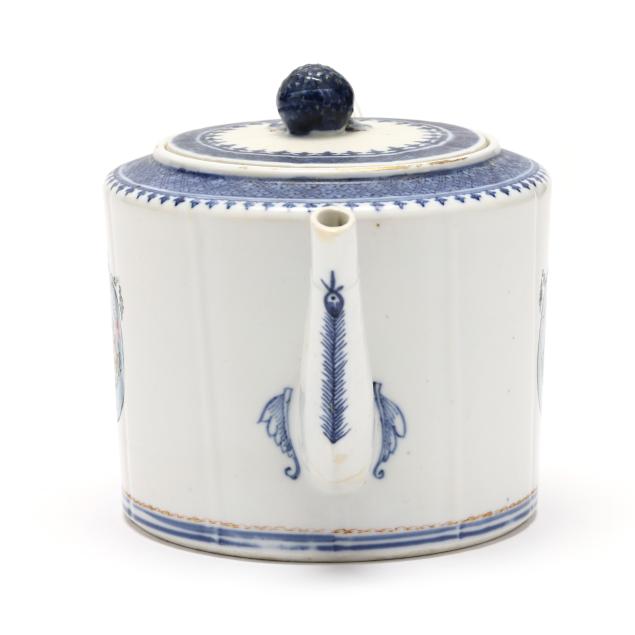 18th century, a porcelain teapot with family crest, cobalt blue diaper borders and sprays to braided handle and cover.