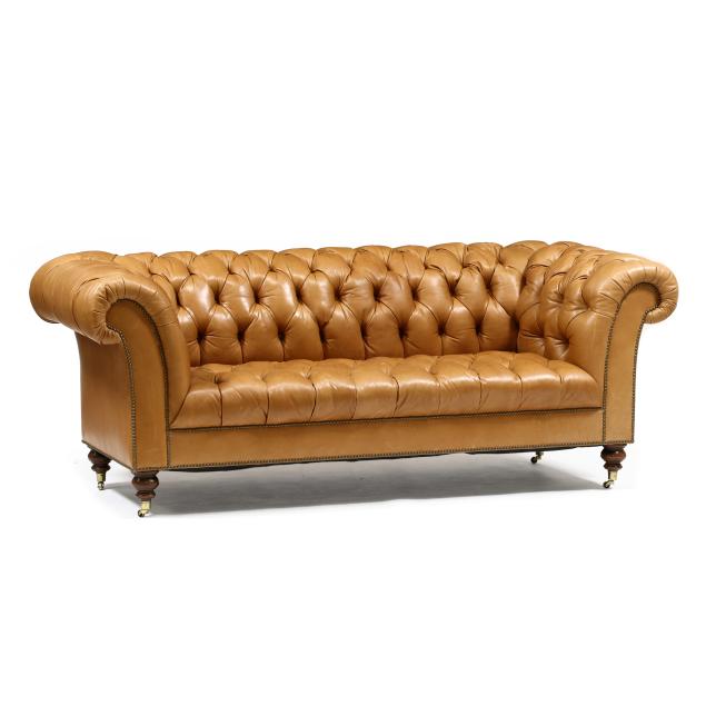 Late 20th century, supple tan leather with brass nail head trim, turned wood feet with brass casters, labeled.