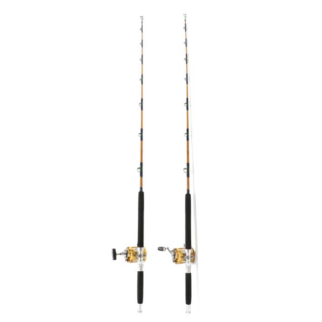 Two St. Croix Seafari Series rods marked SU-60XH / LINE WT. 40-80 LB. with Penn International 30TW reels with serial numbers A940438 and A940413.