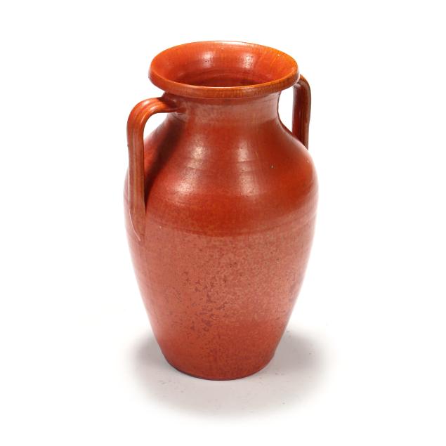 Circa 1935, chrome red glazed earthenware with a down turned flat rim, angular arched strap handles, tapered body, with a glaze that is gently speckled creating an attractive area with a crystalline effect, not signed.