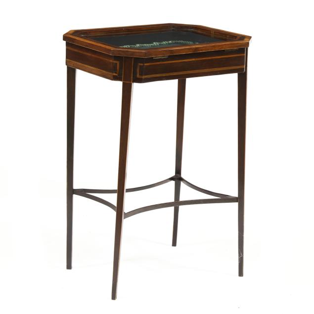 Circa 1900, mahogany veneer with light and dark wood inlays, rectangular form with canted corners, hinged lid with inset glass, green plush upholstered interior, straight tapered legs with shaped stretcher base.