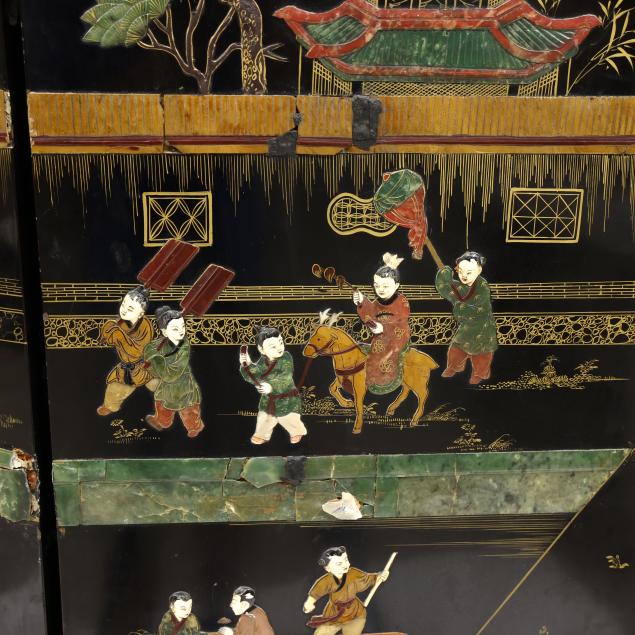 Late 19th or early 20th century, a black lacquered wood panel screen decorated with a palace and garden scene executed in carved applied stones and gilt, reverse side with gilt painting of flora, metal capped feet.