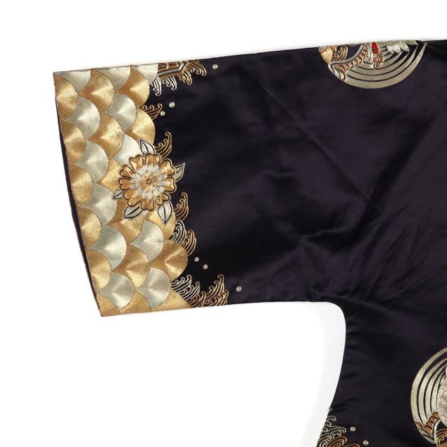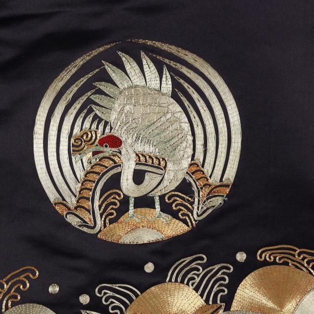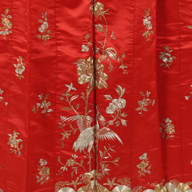 Qing dynasty (1644-1912), late 19th or early 20th century, includes a navy blue satin jacket heavily embroidered with gold and silver wrapped silk thread, featuring eight crane roundels, the hem of the jacket and sleeves is decorated with round wave pattern in gold and silver with sprays above, large blossoms populate waves, embroidered floral sprig around the neck, three frog closures to front, lined with lavender purple silk, and a red silk skirt, with the same wave and spray pattern above hem, center panel with a crane perched on a large blooming peony plant, floral sprays populate the rest of the skirt, loops to left and right on top border, unlined.