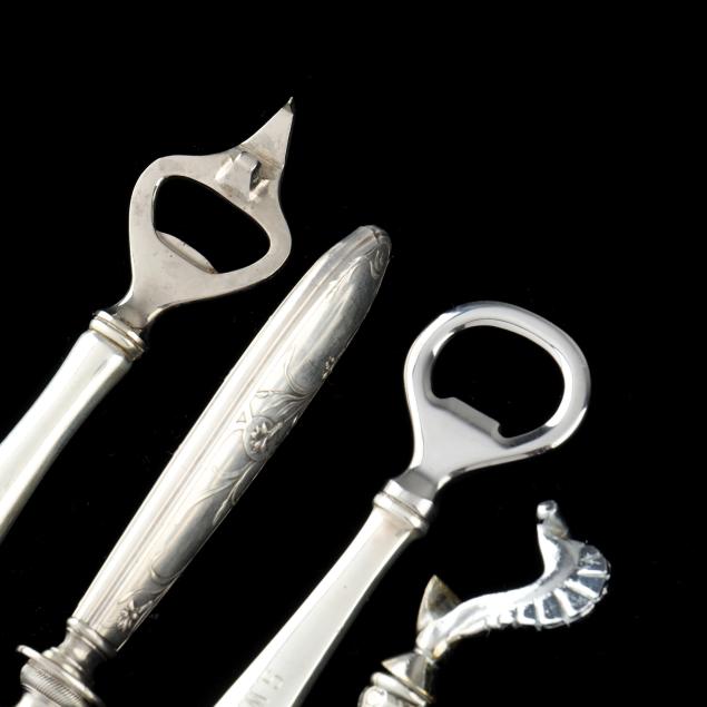First, a French 1st standard silver manche a gigot, partially rubbed maker's mark, with iris decoration to the handle, without a monogram; and (3) American sterling handled bottle openers including (1) marked "sterling" with a foliate handle, (1) S. Kirk & Son
