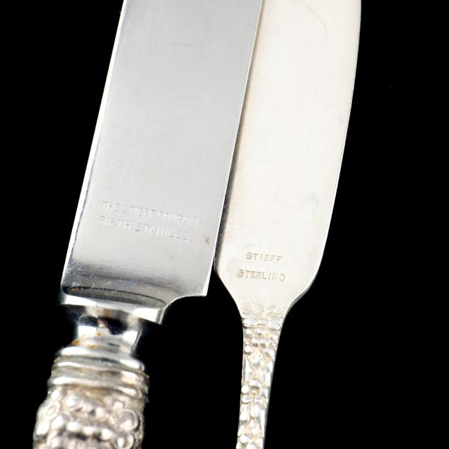 Baltimore, (62) pieces, to include: (8) French hollow handle knives (8 7/8 in.); (4) hollow handle steak knives (8 1/2 in.); (12) forks (6 7/8 in.); (8) salad forks (6 in.); (11) teaspoons; (6) oval place spoons; (3) tablespoons; (1) gravy ladle; (2) cocktail forks; (7) flat handle butter spreaders. Most with "F" monogram.