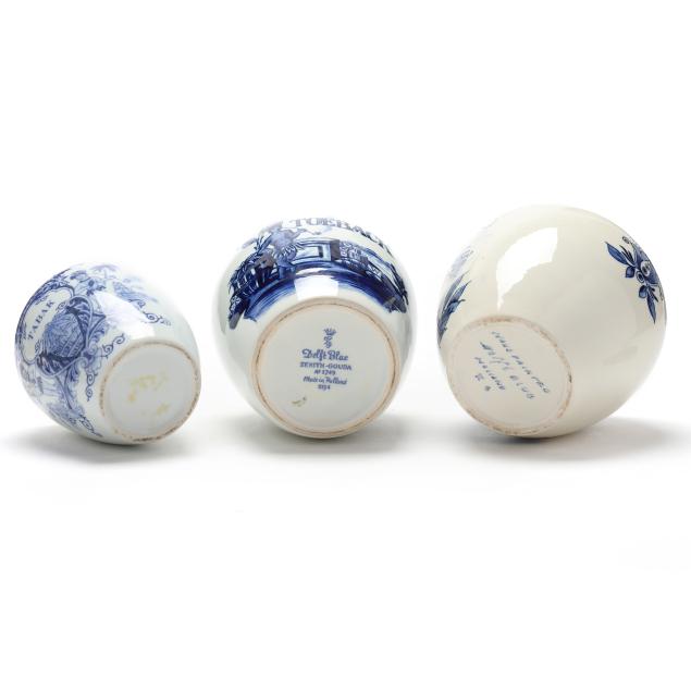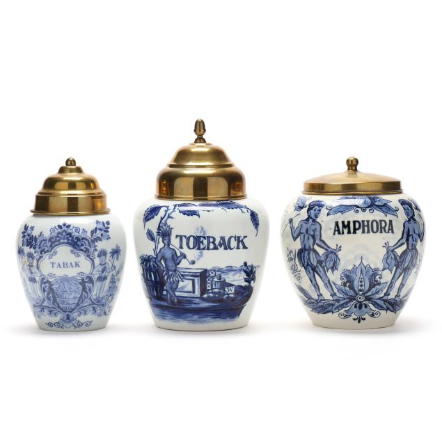 20th century, each decorated in blue with a native smoking, the two larger jars are marked "Delft Blue" on the underside and the small jar is unmarked. With brass caps.