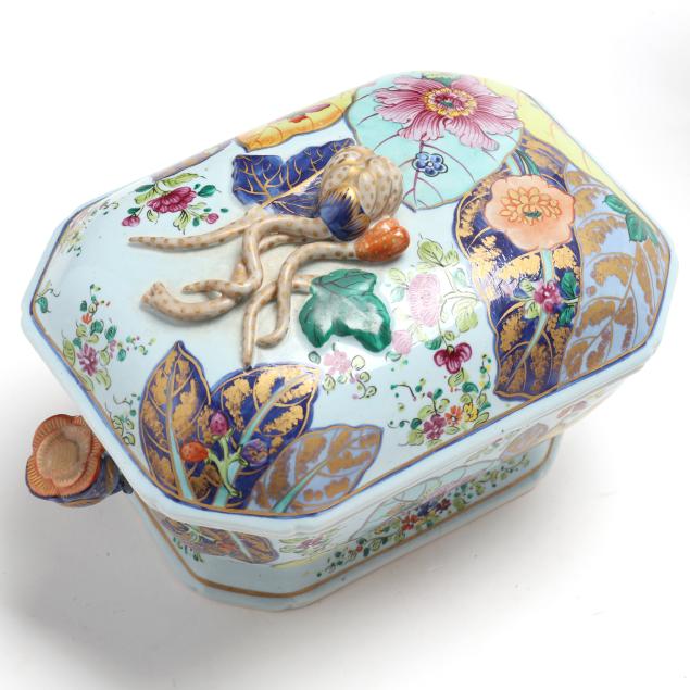 Lowestoft reproduction, 20th century, to include a monteith (6 x 10 1/4 in.), a vase (6 in.), a small covered tureen (5 x 6 in.) and two (2) other pieces, all marked by Mottahedeh on the underside.