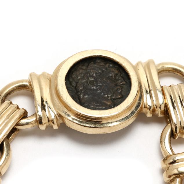 Bracelet with three round links set with a modern copy of an ancient Roman coin of Caracalla, circa 200 AD, and joined with round and bar links, completed with an integrated clasp stamped 14K and with a maker's mark.