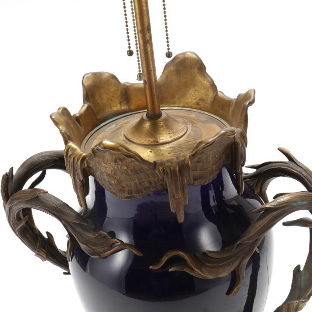 Late 19th century, cobalt glazed porcelain, featuring gilt bronze sinuous cattail double handles, rockwork and foliate grotto rim and base mounts, the porcelain foot underside with incised mark "E B," otherwise unmarked. Now mounted as a three-socket table lamp, includes pleated silk shade.