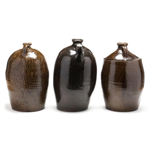 19th century, all with (3) gallon capacity although only one is clearly marked, the dark alkaline glazed jug shows some rutile (two vertical scratches in the glaze); the jug with the pronounced shoulder has what appears to be a scratch "3" on the shoulder and possibly a scratch "LSR".
