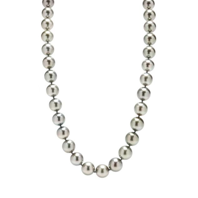 Necklace strung knotted with (37) round Tahitian pearls (11.8mm - 10.0mm) and completed with a white gold ball clasp set with single cut diamond melee, stamped 14K 585 and with a maker's mark.