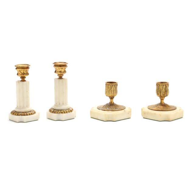 Early 20th century, the first pair of fluted columnar form (5 1/4 in.), the second pair of low form with spreading foliate cast drip terrace (3 1/2 in., each mounted atop a square base with canted corners, unmarked.